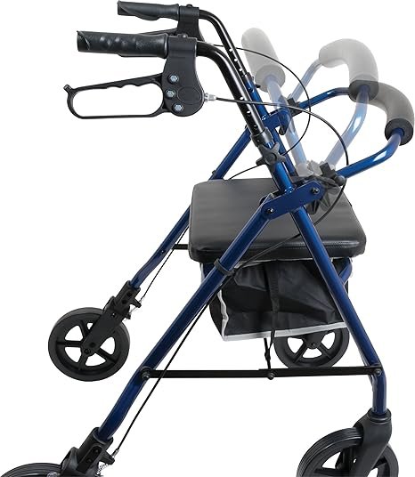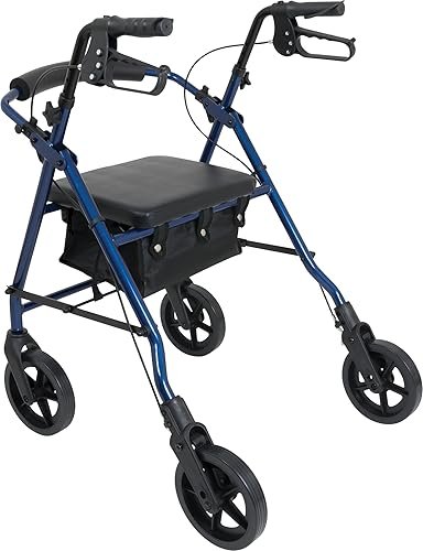 - SMART SAFE and CONVENIENT DESIGN: The ergonomic padded handles are accompanied with an easy-to-operate braking system that can be locked for increased safety when not in motion. What’s more, this four-wheeled walker is also equipped with a waterproof storage bag under the seat for convenient storage and security of your personal items.