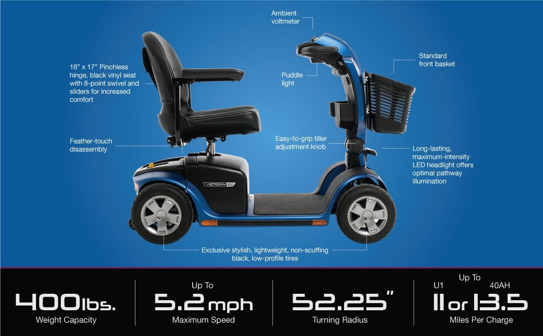 With three different seat sizes to choose from (16”, 18”, 20”), you can feel confident knowing the Victory 10 will fit you like a glove. The wraparound delta tiller even lets you relax and navigate the scooter easily with only one hand, reducing strain. Store your belongings safely in the front basket, and enjoy driving a scooter designed with your comfort in mind. .