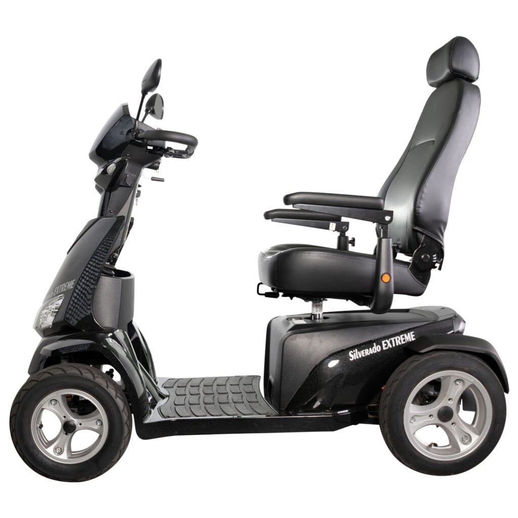The Silverado Extreme Heavy-Duty Scooter offers a top speed of 9.6 mph and full suspension with shock absorption for a smooth ride. With a larger battery, it provides an impressive driving range of up to 55 miles on a single charge, perfect for adventure or extended use.