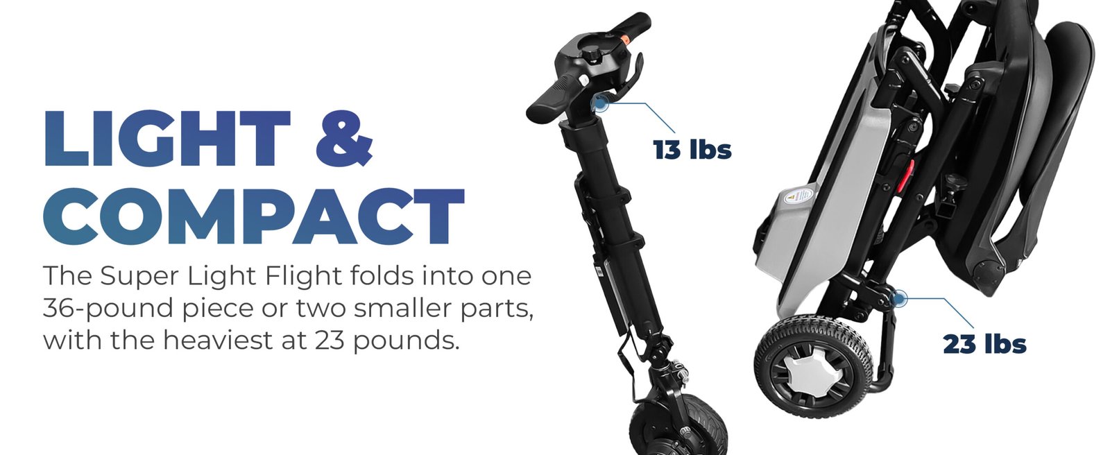 The Super Light Flight Is Easily The World’s Lightest Mobility Scooter, Weighing Only 36 Pounds. Made From A High Quality Aircraft Aluminum Alloy. The Super Light Flight Easily Folds Into A Small Compartment That Will Fit In The Trunk Of “Any” Car And Can Be Taken On A Plane As Carry On Luggage.
