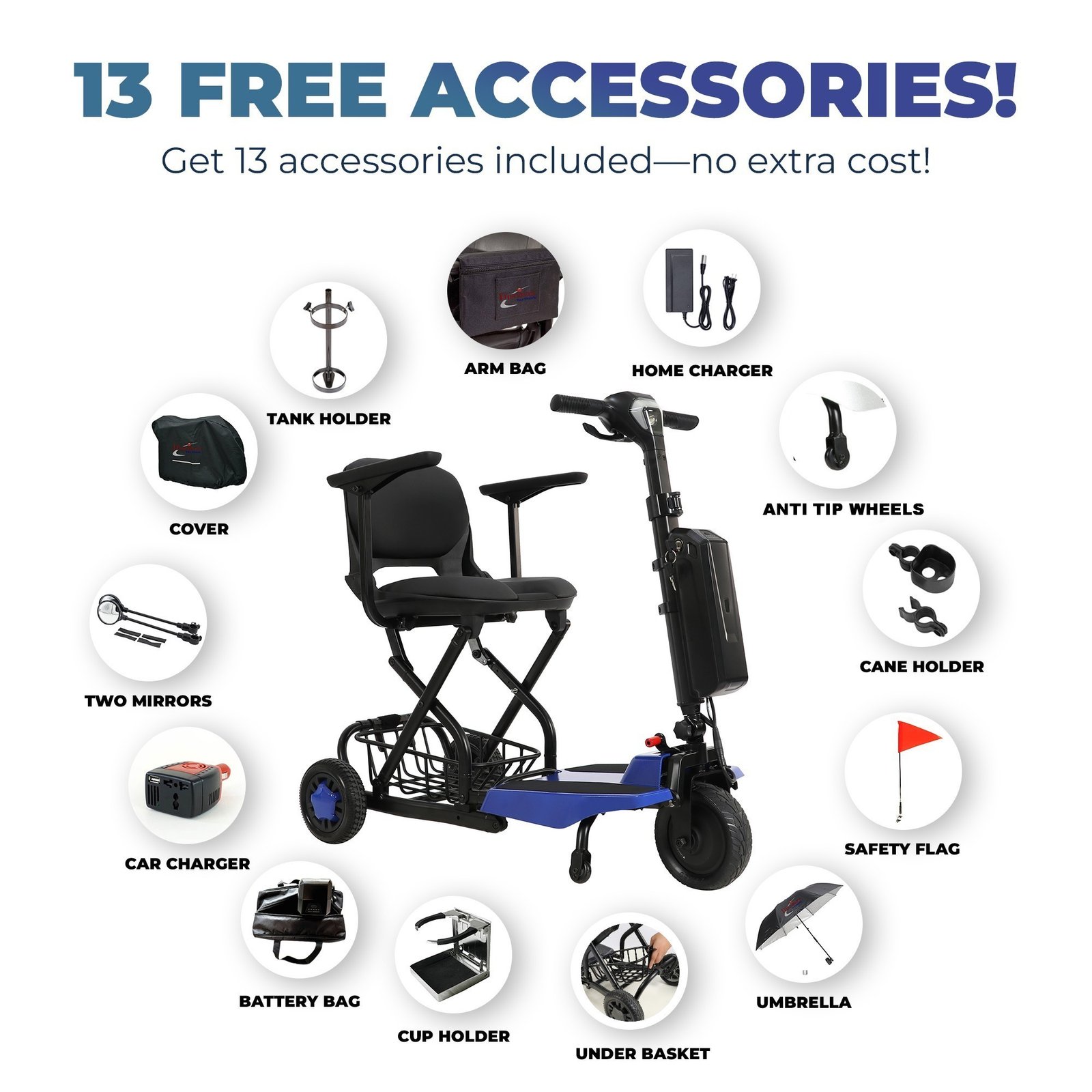 We include a Oxygen Tank Holder Free with the purchase of this scooter. This Oxygen Tank Holder will hold most any size tank. The chart shown on the left indicates with a red arrow all tank sizes this tank holder will accommodate. Also included free are all items listed below.