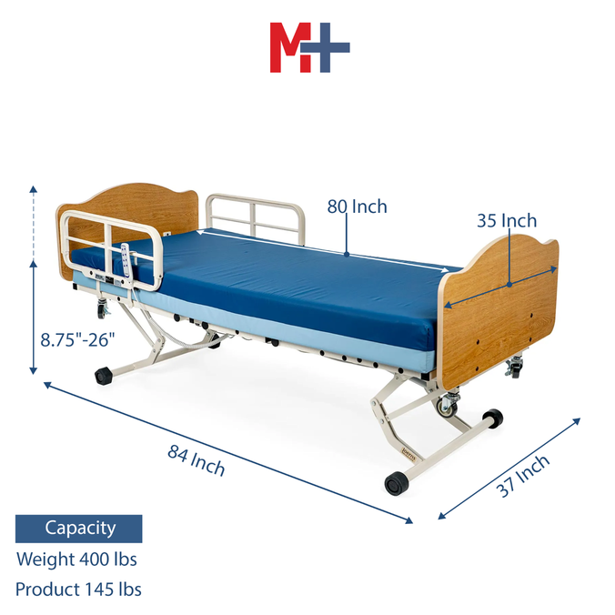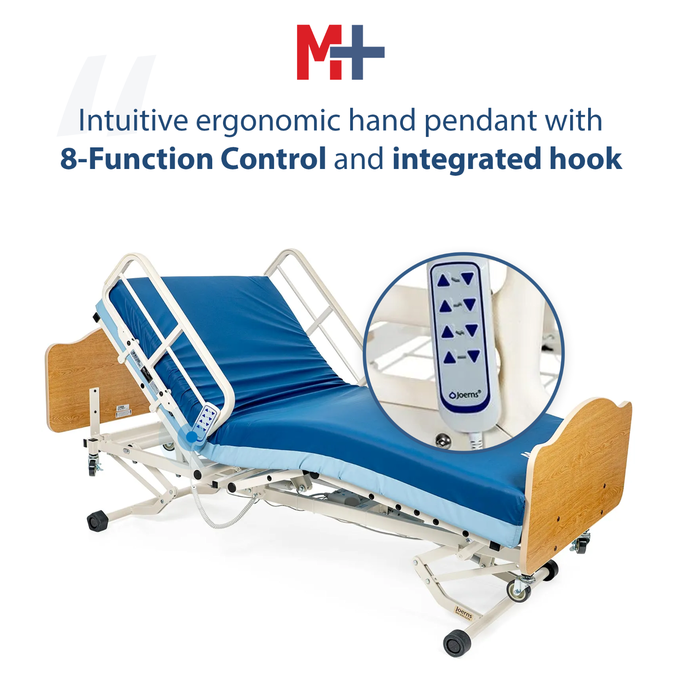 Stop messing with complicated bed controls. The WeCare Hi-Low hospital bed could not be simpler to use and is flexible enough to keep up with your every need. Easily use the 8-function ergonomic hand control to adjust your bed height, back, knees, or enable auto-contour positioning. Four rubber feet lock the bed safely into place, and can lift to smoothly move the bed around your home. This bed comes in split pieces, making it easy to assemble and start using immediately.